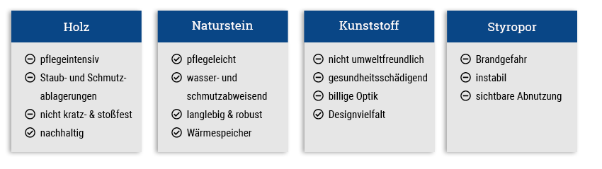 Naturstein ist ein reines Naturprodukt und wird ökologisch abgebaut und weiterverarbeitet. Er besitzt keine schädlichen Inhaltsstoffe und ist daher besonders umweltfreundlich und sogar für Allergiker geeignet. Natursteinarten sind außerdem sehr robust und widerstandsfähig – selbst nach Jahren zeigen sie kaum Abnutzungserscheinungen oder Farbveränderungen. Mit einer Verkleidung aus Naturstein erhalten Sie also ein pflegeleichtes und besonders langlebiges Produkt. Durch eine spezielle Imprägnierung wird das Material wasser- und schmutzabweisender. Eine weitere Eigenschaft ist die Wärmespeicherung, denn die Natursteine behalten Wärme besonders effizient und geben sie nur langsam wieder ab. Indem die Steine mit unterschiedlichen Oberflächenbehandlungen bearbeitet werden, entsteht eine ganz spezielle Optik. So geben sie zum Beispiel in unbehandelter Variante ein antikes Flair und in glattpolierter Version ein modernes Erscheinungsbild ab.