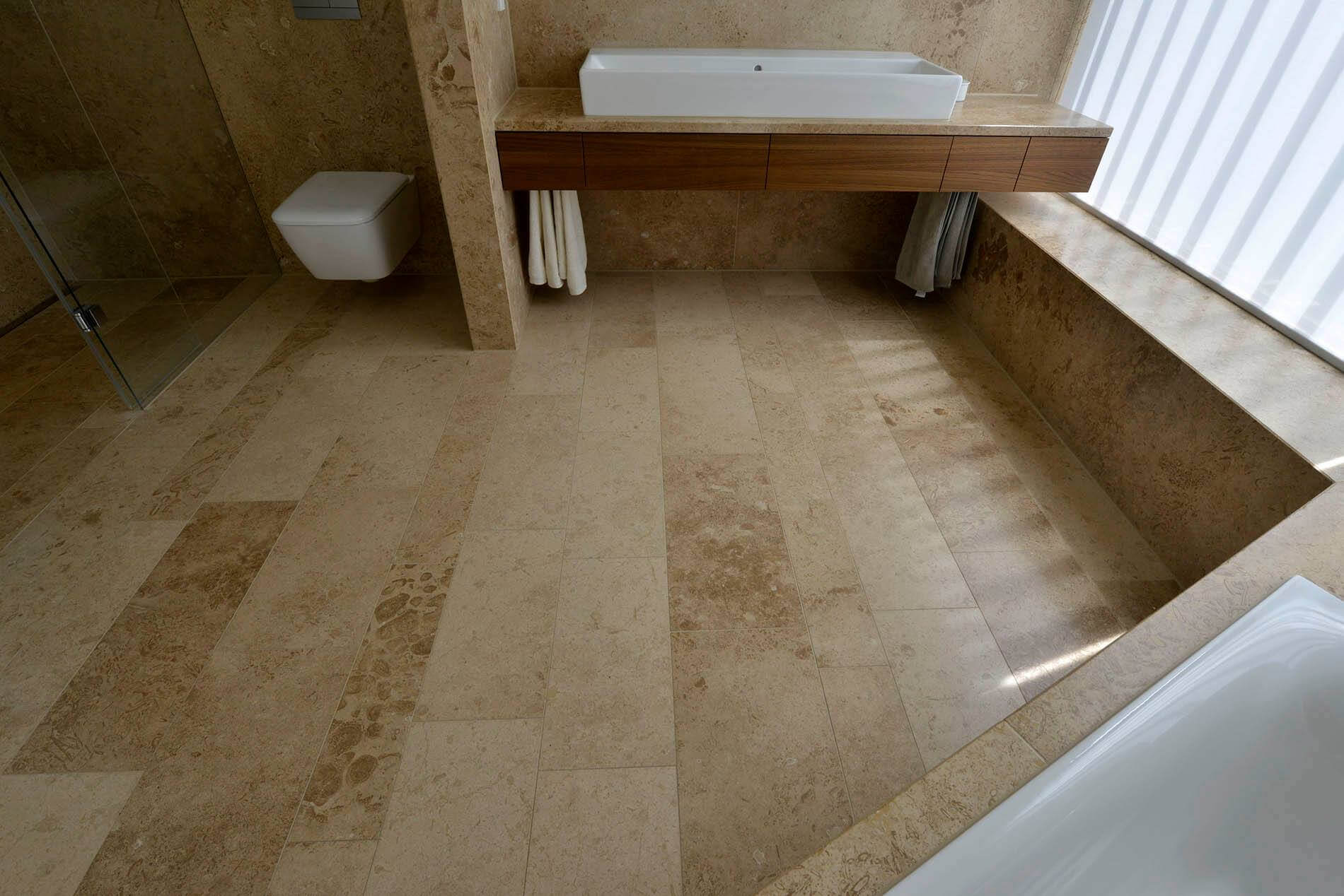 Im Badezimmer liegt Naturstein hoch im Kurs. Für eine Wandverkleidung eignet sich das Material deshalb so gut, weil es im imprägnierten Zustand Nässe und Feuchtigkeit abweist und somit besonders pflegeleicht ist. Natursteinfliesen sind als Wandverkleidung im Bad besonders beliebt, ob als halbhohe Variante oder gesamte Wandverkleidung – die Natursteine schaffen eine edle Optik. Im Badezimmer ist eine Kombination aus Bodenplatten und Wandverkleidung in der gleichen Steinart sehr gefragt. Zudem werden auch Waschbecken, Dusche und Badewanne mit der gleichen Natursteinart verkleidet. Je nach Steinart können Sie dabei einen ganz individuellen Stil kreieren. Mit großen Bodenplatten mit einer geschliffenen oder gespachtelt und geschliffenen Oberfläche entsteht modernes Bad. Für eine mediterrane Optik kann dagegen eine rustikale oder antike Oberfläche gewählt werden.